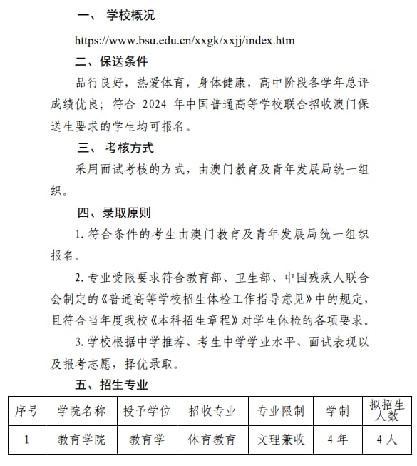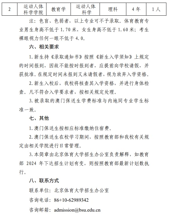 北京体育大学2024年中国普通高等学校联合招收澳门保送生简章